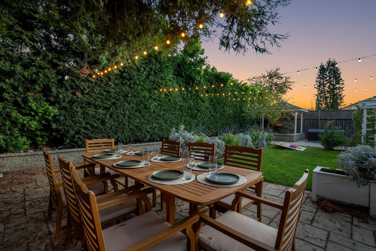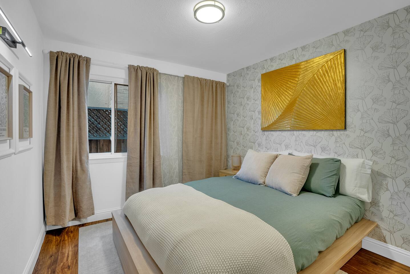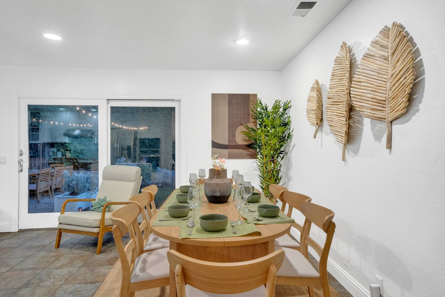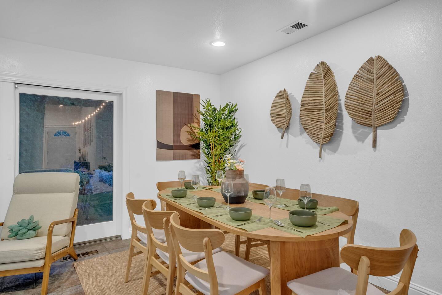 🌸 Japandi-Style Decor: Minimalist elegance paired with cozy functionality to create a calming ambiance. 💦 Jacuzzi: Unwind in your private outdoor jacuzzi under the stars. 🎮 Game Room: Equipped with entertainment for all ages—perfect for game nights. 🍴 Fully Equipped Kitchen: Prepare your favorite meals with ease using our state-of-the-art appliances. 🔥 Barbecue Grill: Enjoy al fresco dining with our top-notch grill in the garden. 🌿 Beautiful Garden: Stroll through lush greenery or savor your morning coffee in a peaceful outdoor setting. BEDROOMS Within the home, you’ll find four generous bedrooms filled with luxurious King and Queen beds, and floor mattresses topped with soft, quality linen along with plenty of space for you to unpack and make yourself at home. ⭐️ 1. Master bedroom (King bed, access to garden, private master bathroom, large closet) ⭐️ 2. Queen bedroom (Queen bed, extra large full length mirror, additional bed bench for storage and seating) ⭐️ 3. Queen bedroom (Queen bed with japandi inspired surrounding art piece by famous Japanese artist, Yayoi Kusama) ⭐️ 4.Queen bedroom (Queen bed with japandi inspired surrounding art piece by Kazbeg R.) BATHROOMS Equipped with your bath essentials for your convenience, unwind and freshen up in our full bathrooms. ⭐️ Full set of towels ⭐️ Shampoo, Conditioner, Body Wash, Lotion, Hand soap ⭐️ Hair dryer, Diffuser, Bathroom Mat KITCHEN The kitchen comes fully equipped with everything you would need to cook up all your favorite meals, from the oven to the microwave, to the toaster and blender, to the spacious fridge/freezer. Get your day going right with all the cooking essentials you would need right at your fingertips. ⭐️ Fully equipped and stocked ⭐️ Highlighted appliances: Instapot, Fryer, Skillet, Water Kettle, Coffee Maker ⭐️ Dining table seating 8 comfortably LIVING ROOM Our living room is a serene haven designed to embody the timeless principles of Japandi style, seamlessly blending Japanese minimalism with Scandinavian coziness. ⭐️ Sophisticated Furniture: Sink into plush couches paired with stylish swivel chairs, inviting relaxation and conversation. The natural textures and muted tones create a harmonious ambiance. ⭐️ Art Gallery Appeal: The space features an exquisite art collection, curated to complement the decor with subtle yet captivating pieces that elevate the room's aesthetic. ⭐️ Thoughtful Details: Warm wood finishes, clean lines, and soft, neutral fabrics complete the balanced and serene environment, ideal for unwinding or entertaining guests. GARDEN Unwind and entertain in this expansive, thoughtfully designed garden retreat, ideal for creating cherished memories with family and friends. Here’s what awaits you: 🌿 Jacuzzi: Soak your stress away in the bubbling jacuzzi, surrounded by greenery and tranquility. 🌸 Dining Table for Eight: Share delicious meals under the open sky with our elegant dining setup, ideal for gatherings. 💦 Fountain: Relax to the soothing sounds of a beautiful fountain, adding a touch of serenity to the atmosphere. 🌳 Large Grass Area: Whether it's lounging, picnicking, or playing games, this spacious lawn is perfect for all ages. 🎯 Cornhole Game: Challenge friends and family to a fun game of cornhole on the lawn. 🏡 Gazebo with Hanging Egg Chairs: Lounge in style in our cozy gazebo, complete with luxurious hanging egg chairs to swing your cares away. 🍴 Outdoor Dining: Enjoy meals under the open sky at the table set for eight, designed for comfort and connection. This garden is more than just a backyard—it's your private sanctuary designed to provide peace, joy, and connection. Game Room Bliss: Fun for All Ages Experience the ultimate entertainment hub, thoughtfully designed for excitement and relaxation. Our game room offers: 🎱 3-in-1 Table: A multi-functional masterpiece that transforms from pool to ping pong to a spacious board game table. Comfortably seating eight, it’s perfect for hours of gaming and friendly competition. ⚽ Foosball Table: Bring out your competitive side with this fast-paced classic. 📺 55-Inch Smart TV: Lounge on the two cozy sofas and enjoy your favorite shows, movies, or gaming marathons. 🎲 Board Games Galore: A curated selection of board games ensures fun for groups of all sizes and interests. UTILITY ROOM For longer stays, freshen up your items in our utility room. ⭐️ Washer ⭐️ Dryer ⭐️ Complimentary detergent Nearby Amenties within 5 minutes drive Gym: City Sports Gym, 24-hour fitness Groceries: Costco, Target, Safeway