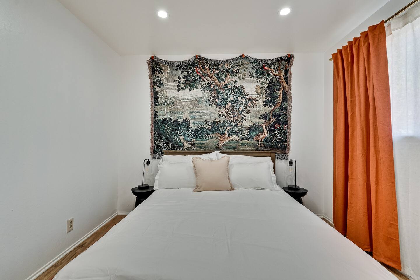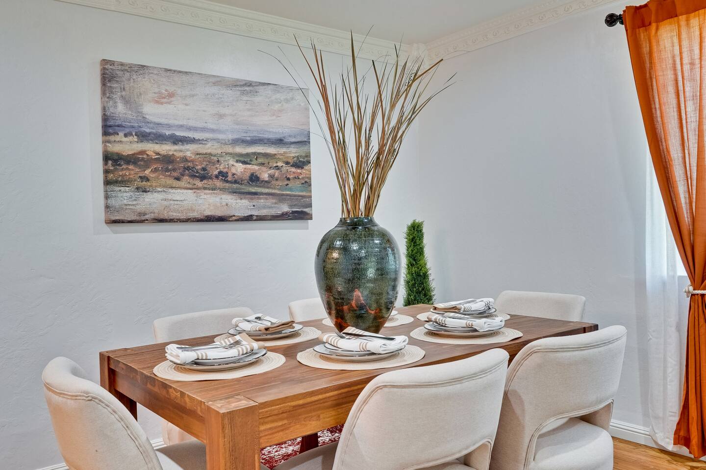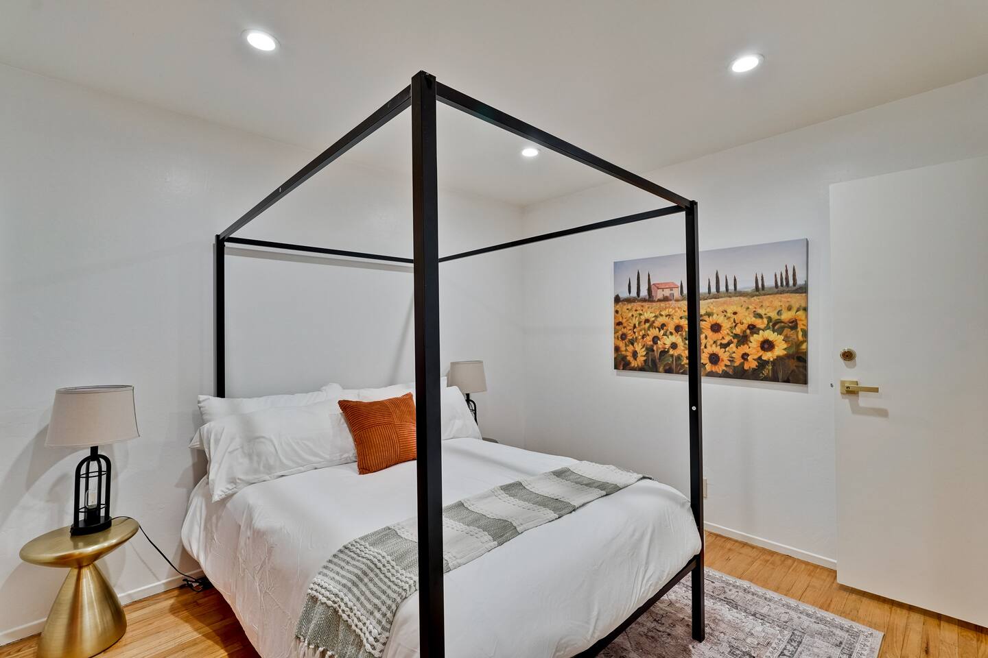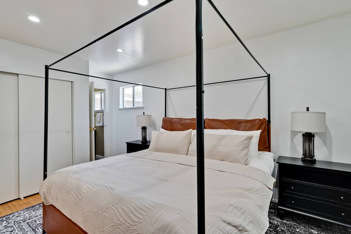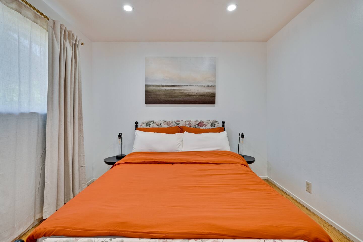 🍋 Fruit Tree Haven: Stroll through a lush garden filled with lemon, orange, and plum trees—your own slice of Mediterranean paradise. 📚 Library Lounge: Cozy up with a good book in our Italian-inspired lounge, featuring curated reads, plush seating, and warm ambient lighting. 🛏️ Tuscan-Inspired Decor: Embrace timeless Italian charm through earthy tones, textured finishes, and classic elegance throughout the home. 🌿 Greenery-Filled Backyard: A tranquil retreat surrounded by mature trees and landscaping, perfect for morning coffee or sunset wine. 🪞 Elegant Bathrooms: Both bathrooms are styled with dual large mirrors, curated amenities, and thoughtful lighting. 🛒 Prime Location: Nestled in Almaden’s serene neighborhood—Costco, Safeway, Target, and top restaurants all just 5 minutes away. BEDROOMS Enjoy restful nights in thoughtfully designed sleeping spaces with luxury linens and serene ambiance. ⭐️ 1. Master Bedroom: King Canopy bed, private master bath, large closet. ⭐️ 2. Queen Room: Queen bed, full-length mirror, and ample storage in the closet. ⭐️ 3. Queen Room: Queen bed, warm Tuscan tones and soft drapes. ⭐️ 4. Full Room: Full-size canopy bed, cozy and compact with natural light and charming accents. BATHROOMS Refresh and recharge in spa-inspired bathrooms. ⭐️ Two full bathrooms ⭐️ Dual oversized mirrors for added style and function ⭐️ Stocked with fresh towels, shampoo, conditioner, body wash, hand soap ⭐️ Hair dryer, diffuser, bathroom mats included KITCHEN Whether whipping up a quick breakfast or hosting a group dinner, our fully equipped kitchen has everything you need. ⭐️ Rice cooker, water kettle, coffee maker ⭐️ Oven, microwave, oven toaster, blender ⭐️ Dining table seats 6 comfortably ⭐️ Stocked with cookware, utensils, and basic pantry staples LIBRARY LOUNGE & LIVING ROOM Our Italian-inspired lounge blends old-world charm with functional elegance. ⭐️ Lounge Seating: Velvet armchairs, large bookshelves with handpicked titles, warm lighting ⭐️ Decor: Tuscan textures with rustic wood, wrought iron accents, and terracotta hues ⭐️ Open-Concept Living Room: Plush sectional seating, refined finishes, and a calming atmosphere perfect for conversation or reading GARDEN Designed for serenity and socializing, the backyard is your private oasis. 🌳 Fruit Trees: Lemon, orange, and plum trees throughout the garden 🌱 Large Lawn: Ideal for picnics, yoga, or family games 🪑 Outdoor Lounge: Comfortable seating to soak up the serenity 🏡 Mediterranean touches: Gravel paths, planters, and flowering accents complete the look 🎯 Cornhole Game: Challenge friends and family to a fun game of cornhole on the lawn. UTILITY ROOM Perfect for extended stays. ⭐️ Washer & Dryer ⭐️ Complimentary detergent provided NEARBY AMENITIES (within 5-minute drive) 🛒 Groceries: Costco, Safeway, Target 🍽️ Dining: Local cafes, family-run Italian spots, and casual eats 💪 Gyms: City Sports Club, 24 Hour Fitness